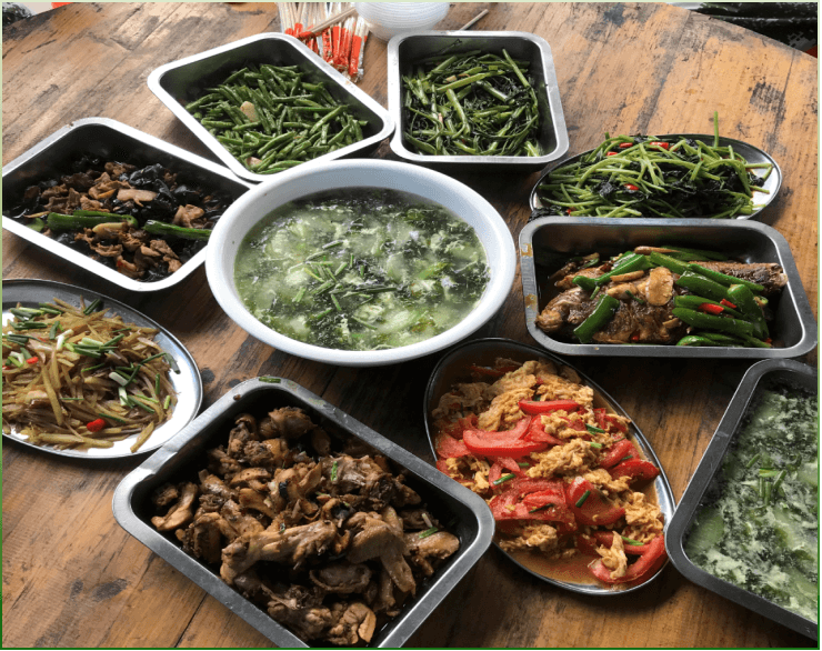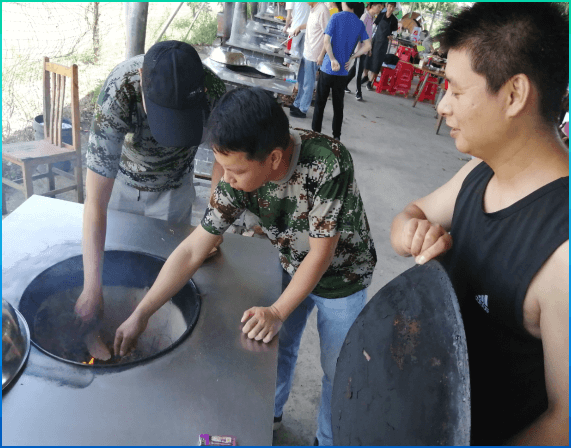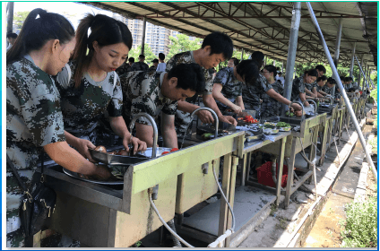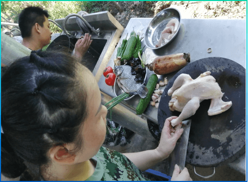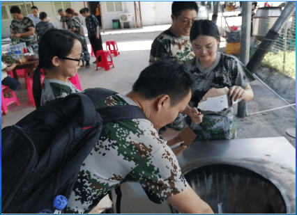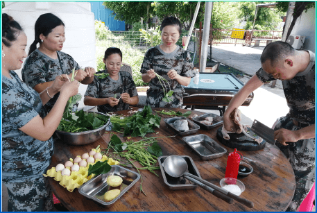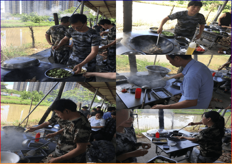 團隊有序分工,摘菜組、清洗組、切菜組、生火組、炒菜組瞬間產生,大家各司其職。